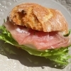 生ハムとチーズの最高のコンビに甘い米粉パンが合うんです!パンはフランスパンのように硬く見えるけど食べるとモチッとした食感を味わえます。小ぶりな量なのでペロリと食べれます。中身は生ハム、クリームチーズとレタスが入っています。ランチにおすすめです。