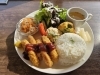 サラダ、スープ、おかず、ごはんがバランスよく盛りつけられた、見た目にもうれしいワンプレートランチです。